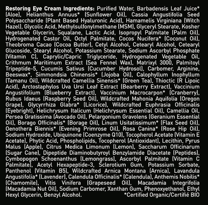 - Key Ingredients: Natural & Certified Organic ingredients, including aloe, DMAE, MSM, hyaluronic acid, protein peptides, and caffeine.