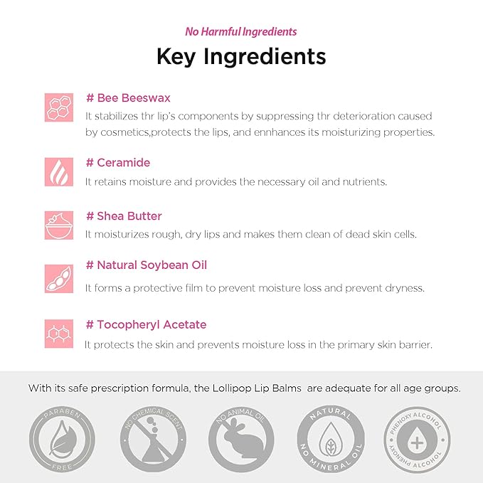 - Moisturize your lips with Beeswax: The Lollipop Korean Lip Balms are formulated with Beeswax, known for its excellent hydrating properties that lock moisture in your lips; as it’s mixed with Soybean Oil, its moisturizing impact is even more effective. The benefits of Beeswax extend to UV ray protection. A truly moisturizing and protective Korean lip balm.