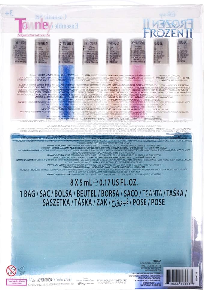 - INCLUDED WITH THE PURCHASE OF FROZEN GIRL LIP GLOSS KIT - Includes 1 Disney Frozen 2 Lip Gloss Set with a Zipper Sequin Bag that comes with 8 lip gloss colors, including pink, blue, dark purple and rose. All colors apply a shimmery look to lips. Flavors include bubble gum, cotton candy, grape and strawberry, blueberry, berry, raspberry and peach. Now your girl can enjoy putting on and practicing makeup with this mild, kid-friendly cosmetic set.