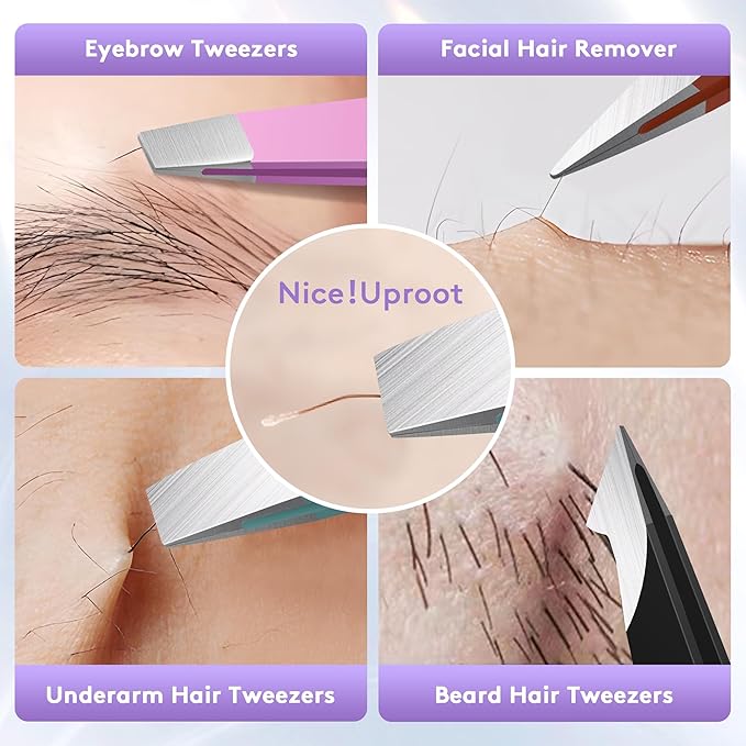 - A clip multi-purpose all-around king: tweezers set has four kinds of clip mouth design, eyebrow/armpit hair/mustache/false eyelashes/white hair all done! Slant mouth, flat mouth, hook head, pointed head, four kinds of clip mouth switch at will, male shaving care, female eyebrow shaping, the whole body hair a clip to get it done, lazy people must have! Perfect grooming tool set for men and women. Ideal Christmas gift, birthday gift, Valentine's Day gift.