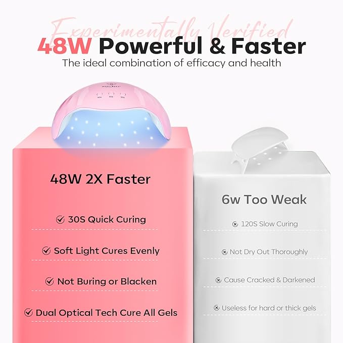 - Effieient Nail Lamp: Modelones 48W nail lamp features 3 timer settings (30s, 60s, 90s) and an automatic sensor that turns the light on when you insert your hand and off when you remove it. We recommend using the 30-60s settings for thinner layers of poly gel and for thicker layers, 60-90s or more to ensure thorough curing. Enjoy a faster and more convenient nail experience with our 48W nail lamp