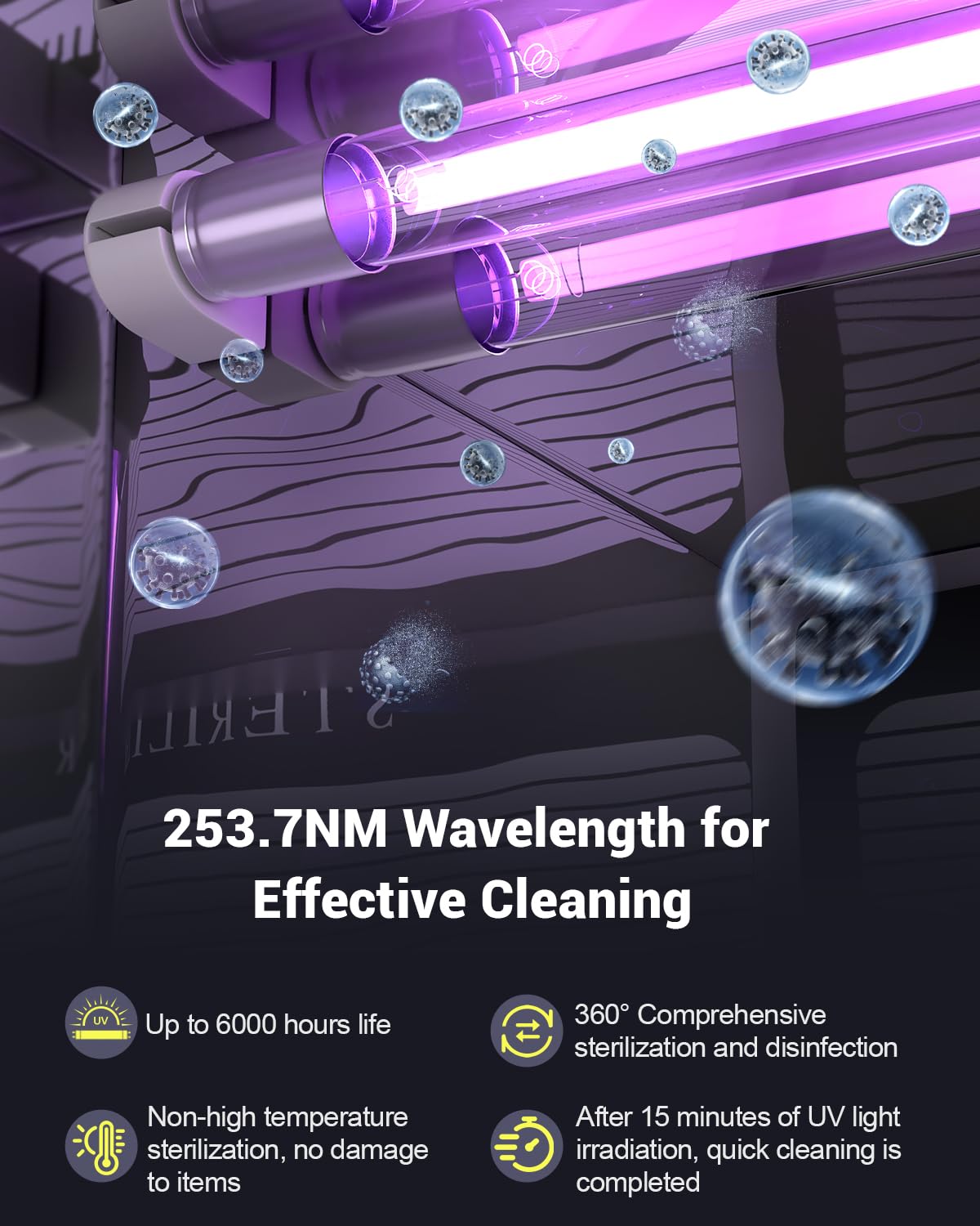 - 【Quiet and Chemical-Free Sanitization】 Enjoy a quiet and odorless cleaning process. Our UV sanitizing cabinet uses no chemicals or toxins, making it an eco-friendly and safe way to keep your items clean.The manufacturer has completed EPA registration, EPA EST No. 97788-CHN-1.