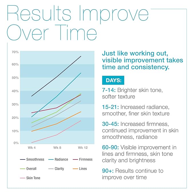 - PROFESSIONAL LEVEL RESULTS: Lines + Wrinkles. + Crepiness + Firmness + Lift + Radiance + Brightness + Skin Tone Clarity + Smooth Texture + Soft Suppleness. Brighter skin tone, improved clarity and boosted radiance within 14-21 days. Results accelerate in 60-90 days with dramatic visible improvements in fine lines, firmness and smoothness. Results continue to improve over time with long-term use.