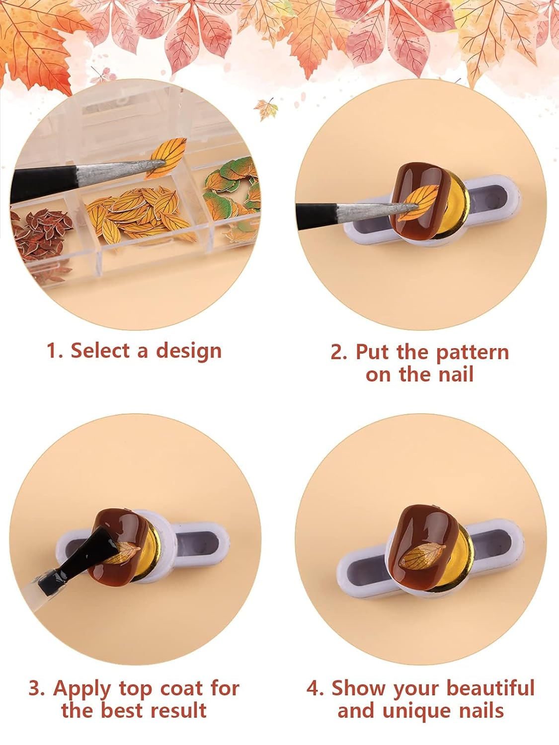 - Easy to Use: Clean the surface of your nails first, then apply nail polish. Put the leaves on the nails, and finally apply the top coat.