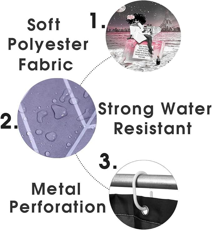 4PCS Sexy Black Girl Shower Curtain Set, Inspirational Quotes African American Woman Full Moon Starry Sky Eiffel Tower Beach Perfume Fashion Bathroom Decor, Non-Slip Bath Mat, Be Who You are