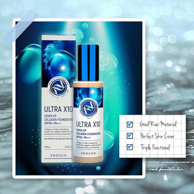 Enough Ultra X10 Cover Up Collagen Foundation, Hydrating Foundation for Dry Skin, Korean Skin Care Tinted Moisturizer Sunscreen, Makeup Cosmetics for Women SPF 50+ PA+++ 3.53oz (#23 Natural beige)