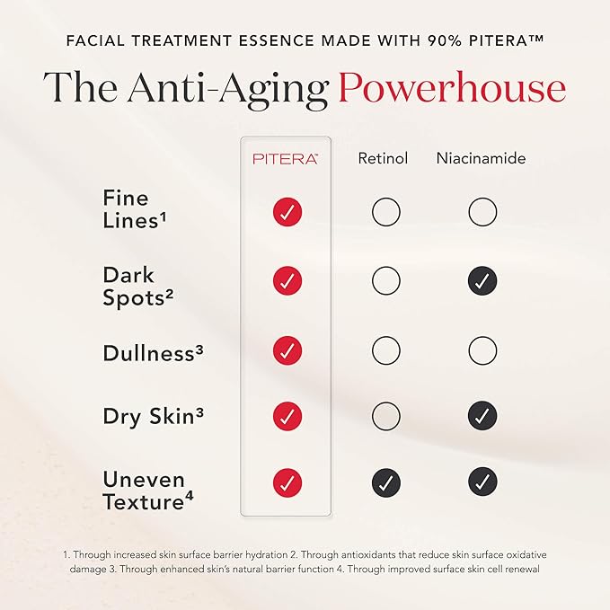- Facial Treatment Essence - Containing over 90% PITERA, our proprietary, natural bio-ingredient derived from fermentation, this anti aging essence rivals the benefits of retinol, Vitamin C and hyaluronic acid, while addressing visible signs of aging and skin damage in just one step.