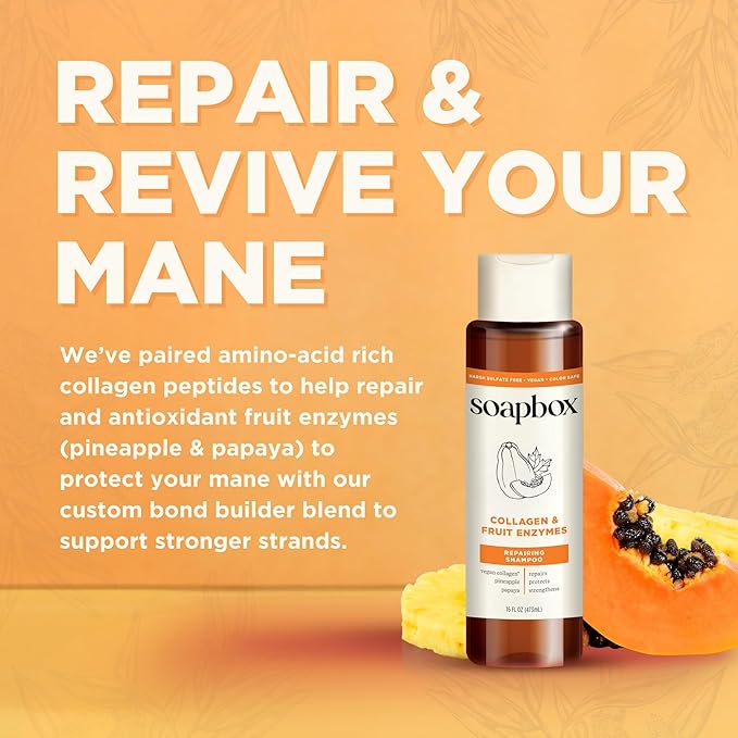 - COLLAGEN SHAMPOO AND CONDITIONER bring a luxurious touch to your daily routine. We've paired amino acid rich collagen peptide with natural pineapple and papaya antioxidant fruit enzymes to help strengthen your hair’s bonds and protect against further damage. Our formula is gentle enough for all hair types for men and women.