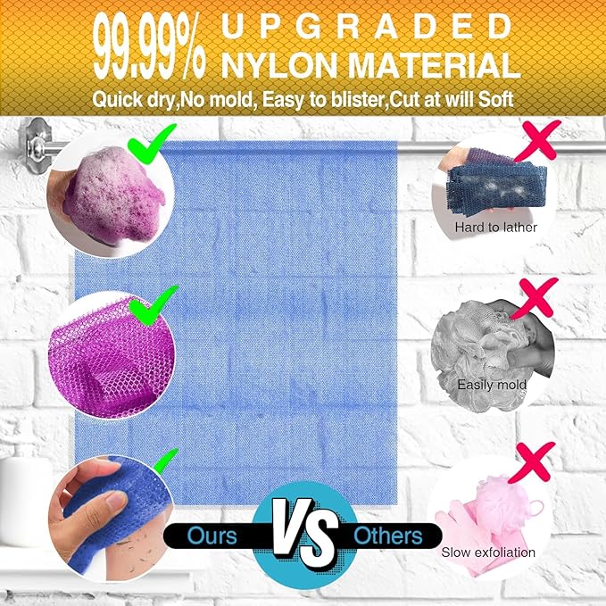 - 【Better quality material】Crafted from a safe and reliable new type of nylon, our long bath net sponge is durable and built for extended use. It's lightweight yet powerful, creating a rich soap lather. Washing machine-friendly and quick to dry due to its porous nature, ensuring a clean and enjoyable bathing experience.