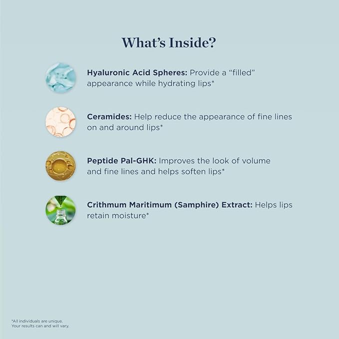 - PREMIUM INGREDIENTS: Each tube is packed with lip-supporting agents, including Hyaluronic Acid Spheres, Ceramides, Peptide Pal-GHK, and Crithmum Maritimum (Samphire) Extract.