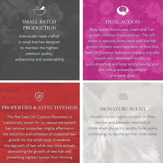 - DUAL ACTION: Body butter moisturizer cream and hair growth inhibitor in one product. The rich cream is naturally formulated with the hair growth inhibitor main ingredient of Pure Red Saad Oil (Egyptian Cyperus Rotundus) keeping you silky smooth with long-lasting results. Its quick-absorbing and long-lasting leaving your skin with a renewed hydration and warm glow.