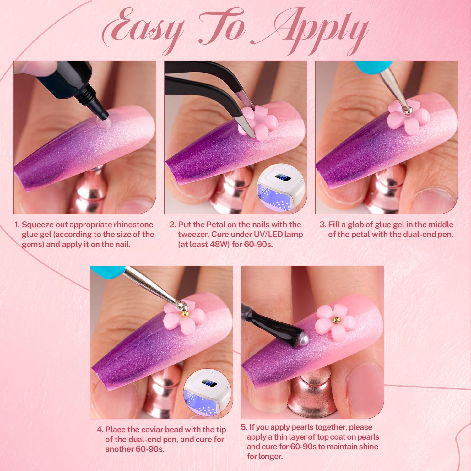 - ✿ Package Content -- It comes with assorted nail charms, including colorful flower nail charms with white half round pearls, 20 pcs butterfly charms, shiny clear & AB glass rhinestones, and mini metal caviar beads. A tube of 15ml nail charm glue (UV curing needed), tweezers and picking pencil are also equipped for your convenience.