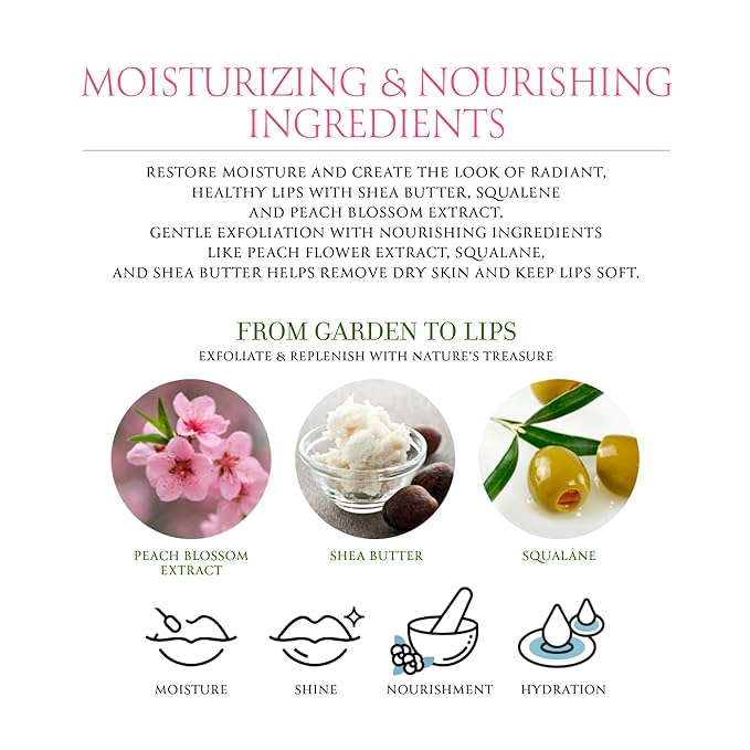 - Nourishing Formula: Infused with Shea Butter, Squalene, and Peach Blossom extract to restore moisture, exfoliate gently, and keep lips soft and radiant.