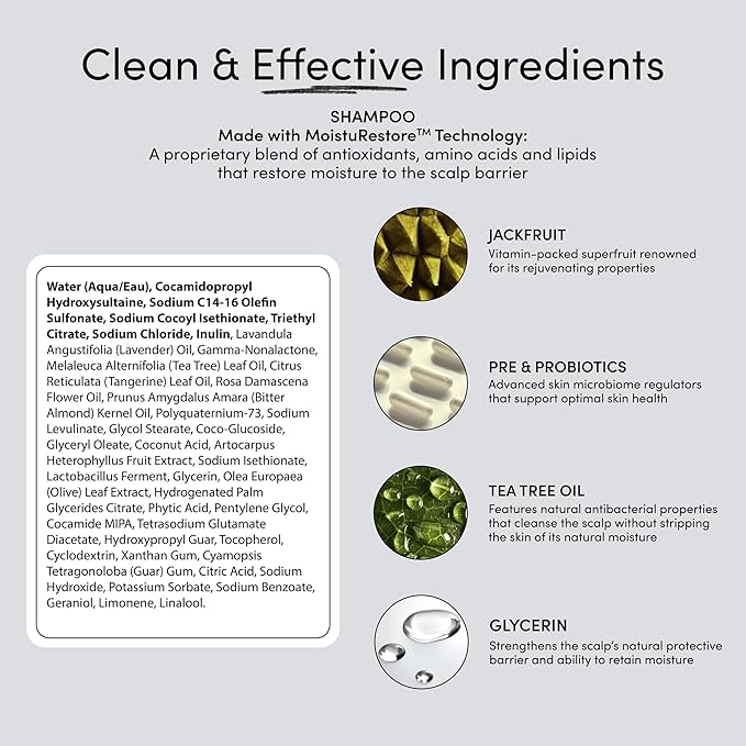 - Target the Root Cause: Our Hydrating Shampoo combines powerful ingredients to rebalance and nourish your scalp. Tea Tree Oil clarifies and soothes, Coconut Oil nourishes and protects, Decylene Glycol regulates oil production, and Aloe Vera hydrates. Together, these ingredients ensure a healthier, more comfortable scalp and soft, shiny hair.