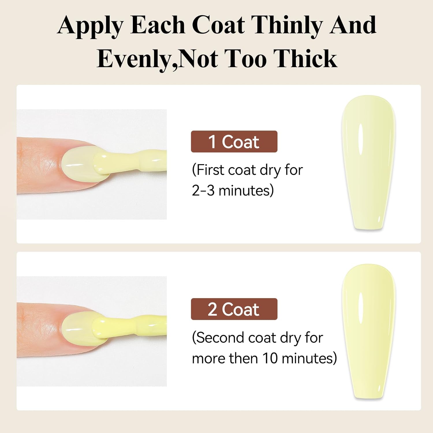 - Warm Tips: It is recommended to apply a base and top coat to protect the lasting effect of nail polish better; 1 coat of nail polish takes 2 minutes to air dry, and 2 coats will take 5 minutes, you can speed it up with a Hairdryer or Electric Fan