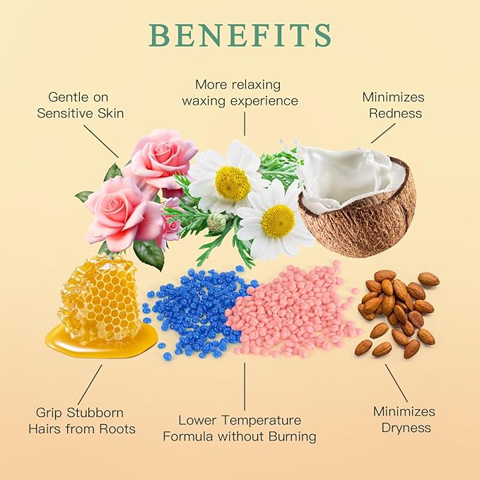 - Material Feature : Low-Melting & Even-Texture – Melts quickly and evenly for effortless spreading, allowing precise application and effective hair removal., Skin-Friendly & Hypoallergenic – Made with natural, ensuring a gentle hair removal process for all skin types, including sensitive skin., Works on All Skin & Hair Types – Effectively removes both fine and coarse hair, ensuring smooth results for all skin types, including sensitive skin. Low-Melting & Even-Texture – Melts quickly and evenly for effortless spreading, allowing precise application and effective hair removal., Skin-Friendly & Hypoallergenic – Made with natural, ensuring a gentle hair rem… See more